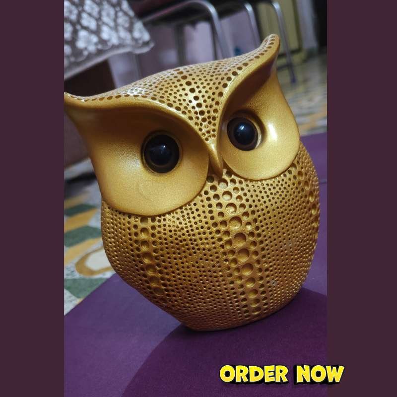 + Free ShippingGolden Handcrafted Resin Classy Owl Ullu For Table Top, Living Room, Home & Office Decor (Size 14cmx13cm): A golden handcrafted resin owl (Ullu) figurine for table, home, or office decor, 14x13cm.