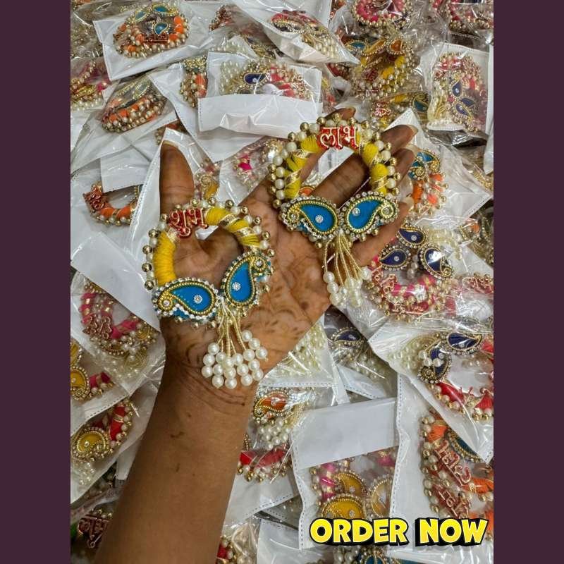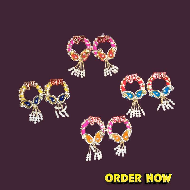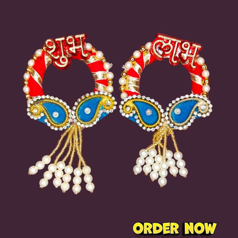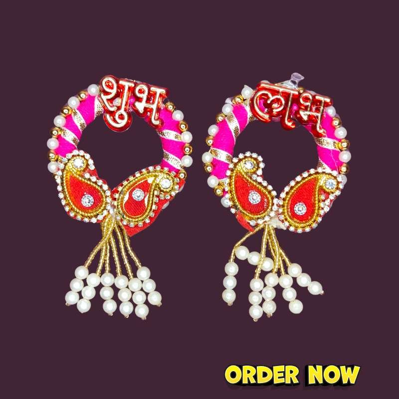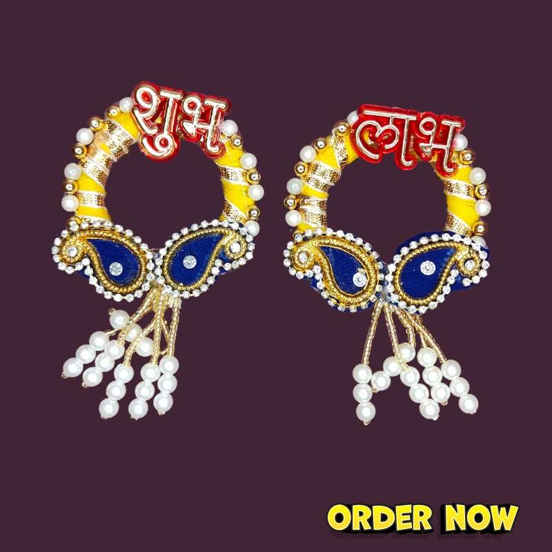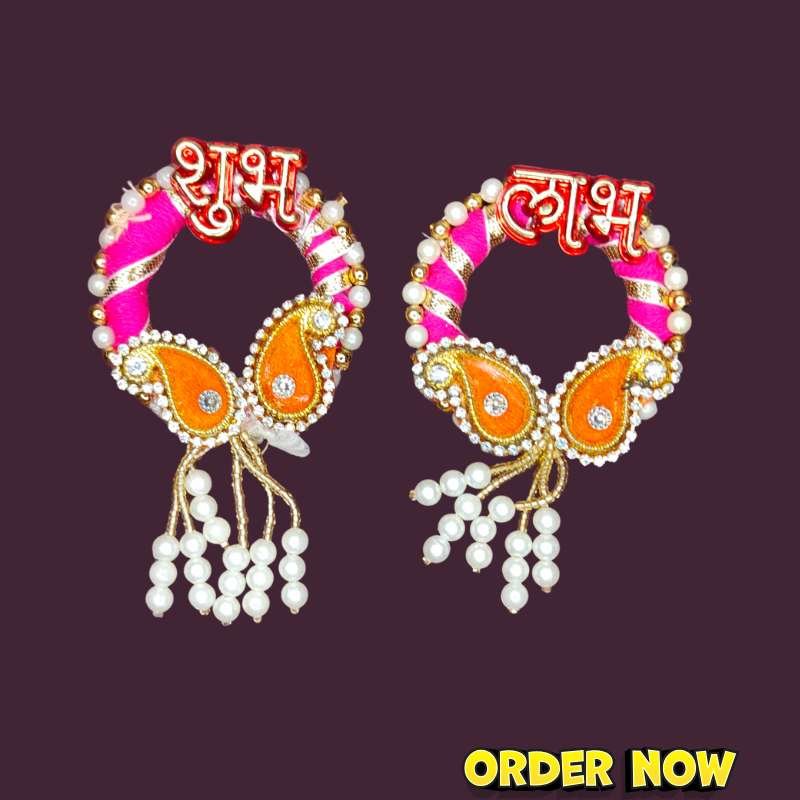 + Free ShippingPair of Beautiful Flower Shubh Labh Hanging (1 Pair): One pair of beautiful hangings combining floral design with Shubh Labh motifs.